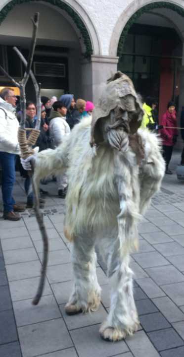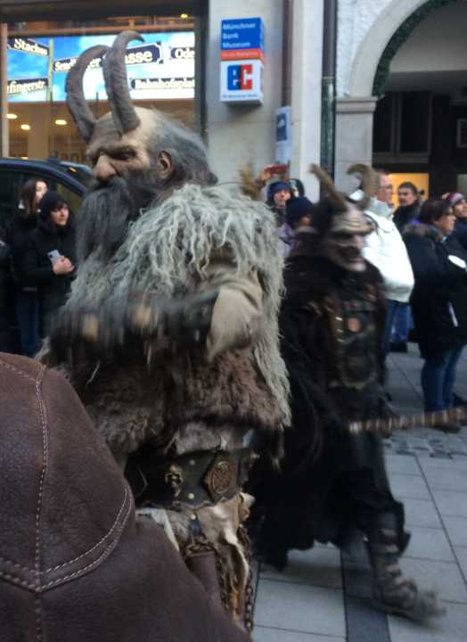 Today was the Krampus run in the Munich Christmas Market. It was pretty packed and cold too. Having snowed the 3 days previous. But we didn't fear the Krampus, since we were nice and not naughty. Otherwise you would have gotten off with a whiping. And no you wouldn't want one of these showing up down your chimney when you were expecting St. Nick. A lump of coal maybe but a Krampus.